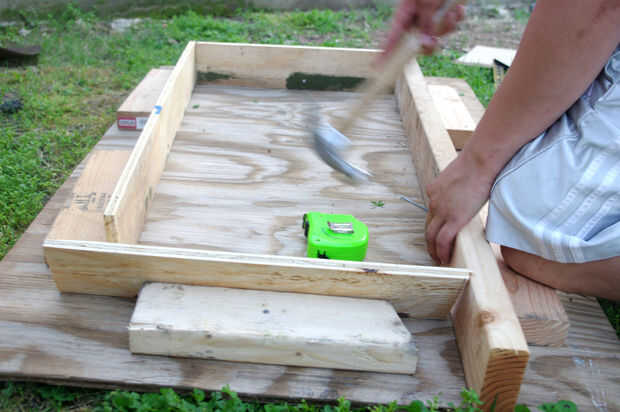 Manera en un marco rectangular en el que se vierte el hormigón. Se utilizó el taller piezas de madera para sostener el hormigón y las piezas de 2 x 4 son simplemente mantener en su lugar el resto de nuestra estructura.