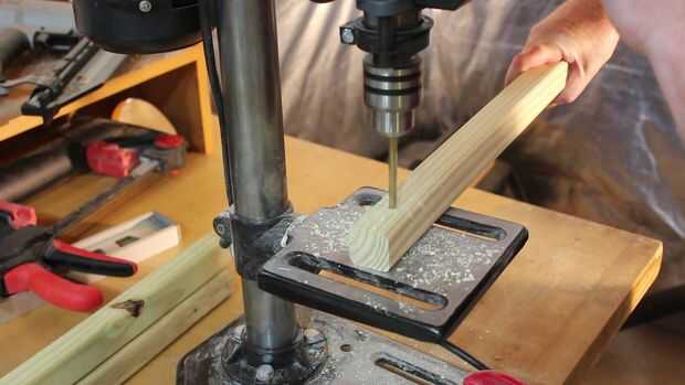 Corte 2x2s por la mitad (4 secciones de cuatro pies). Taladre orificios como se muestra.