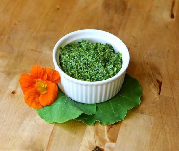 Pesto tradicional se realiza forma hojas de albahaca y piñones tostados, pero los amantes del pesto y astuto cocina popular está recibiendo más inventiva cada año. A la espera de albahaca de verano puede parecer una eternidad a veces (sobre todo porque nunca dura demasiado en cuenta su versatilidad delicioso!), así que ¿por qué no ser creativo con los otros verdes en el jardín? Religiosamente he he plantado Capuchinas en mi jardín como una planta de la compañía --es un insecto natural disuasorio para la mayoría de las plantas, no todos los nutrientes de la tierra cerdo, reseeds sí mismo, y es gran en ensaladas! Resulta que, Capuchinas no sólo son buenas para otras plantas, tiene una alta dosis de vitamina C y aceites de mostaza. ¿Así que la conclusión natural? Cuando has comido suficiente capuchina en ensaladas y está superando a su jardín, hacer pesto!