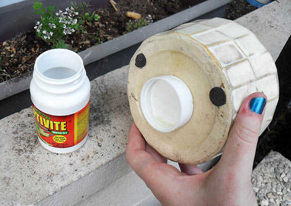 Una vez seco el pegamento, desenrosque la tapa de su botella. Será más fácil llenar el plato de la maceta sin la botella colgando de la parte inferior.