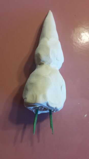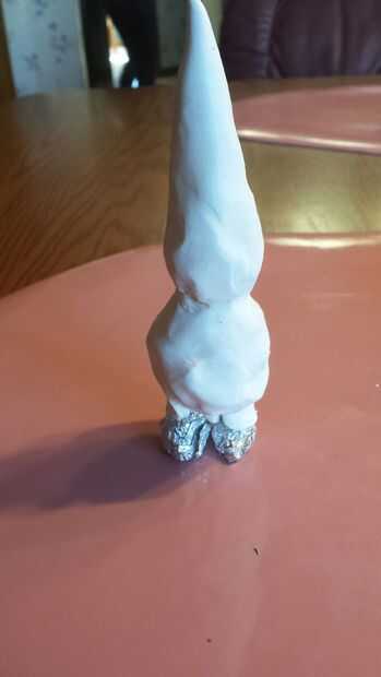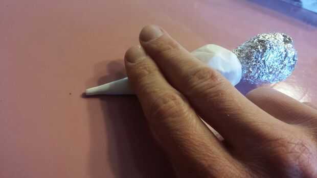 Una vez establecida la base, disipe algunas sculpey. Mina fue < 1/4" densamente para empezar con. Entonces envuelto alrededor de toda la superficie. Rodó la porción del sombrero suavemente en un punto.