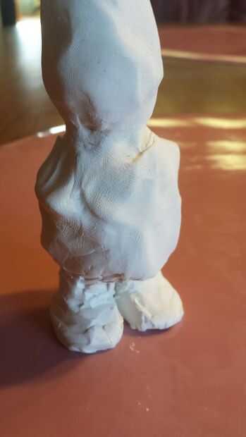 He añadido los pies así. Hice esto por pegar dos pedazos de palillos de dientes en la base de que montar en unos trozos de papel de aluminio. Cubra esto con sculpey así. Esta parte es importante configurar bien la figura se encuentra en su propio.