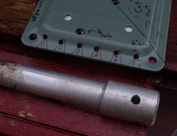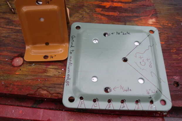 Utilizando el 1/4" agrandar el 4 fuera de borde de agujeros en los soportes y taladre los orificios del soporte del mango en el plato grande. También Perfore el orificio en la parte inferior de la "V" corta.