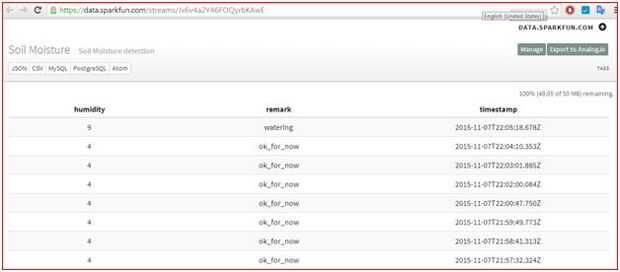 Cuando la humedad del suelo es mayor que "7", se activará la bomba de agua. Tiempo de riego es aproximadamente 10 segundos. Los datos de humedad se registrará en la base de datos aproximadamente cada dos minutos. La columna "observación" mostrará "riego".