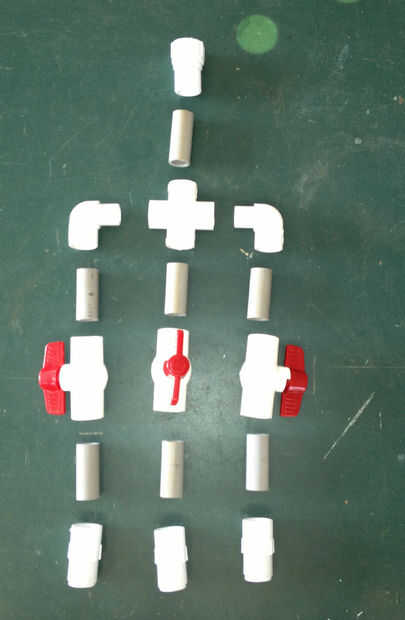 Para construirlo, sólo comienza con la hoja de 1/2" x 3/4" accesorio PVC FHT y trabaje su manera abajo. Encuentra el centro apagado con la manija en la parte superior, y 2 los exteriores giran 90 grados para que sus mangos no interfieran con la de centro.