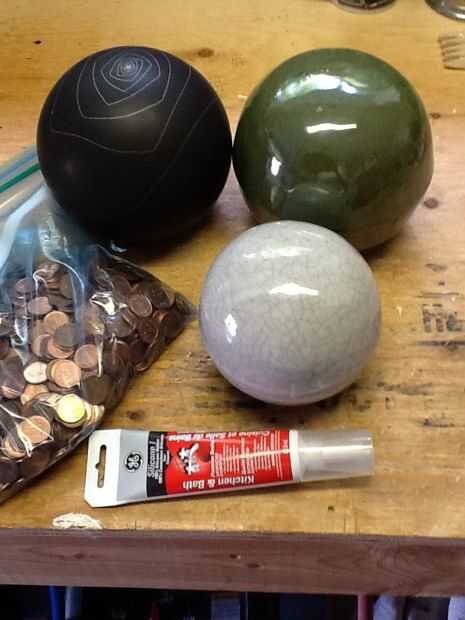 Usted tendrá un montón de monedas. También un objeto redondo usted puede pegarlos a. Debe ser resistente a la intemperie. He encontrado bolas de cerámica esmaltado en una tienda de jardín. Silicona transparente resistente al agua es el único adhesivo que funciona. He utilizado silicona de baño de buena calidad. Estarás triste si utilizas el material barato.
