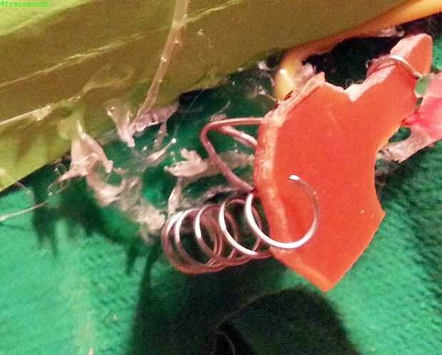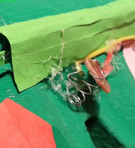 - Pegue un pedazo corto de la primavera de pluma con pegamento caliente a la caja y la pieza de metal plana, por lo que hace volver a la posición sin contacto, como se muestra en las fotos. Esto es una parte delicada, así que hacerlo con paciencia.