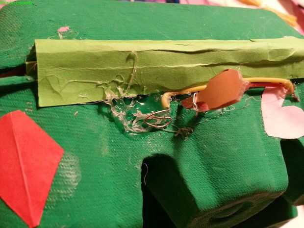 Para hacer los trabajos de la luciérnaga que necesita un interruptor. Hice un interruptor "oculto" cubierto por un papel verde en la parte posterior de la caja, por lo cuando se muestra el cuadro y mantenerla, también puede pulsar los ocultos cambiarán hacen la luciérnaga brilla.