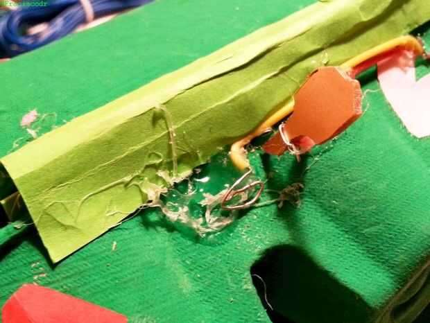 - ahora hacen un pequeño manantial para el LED rojo con sus cables como ves en la imagen. Será su vientre.