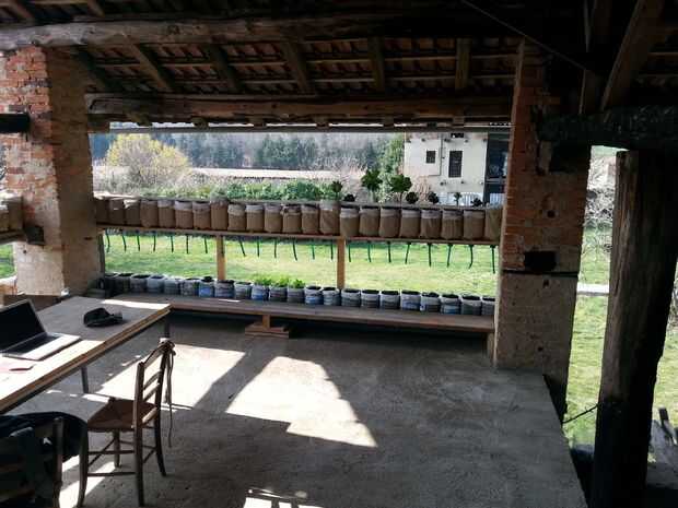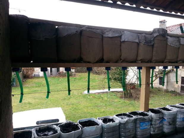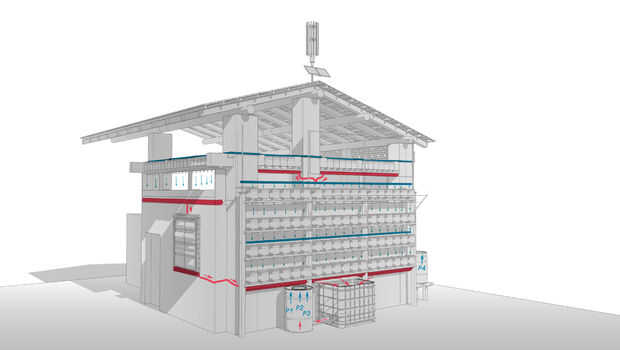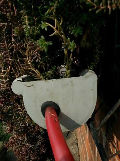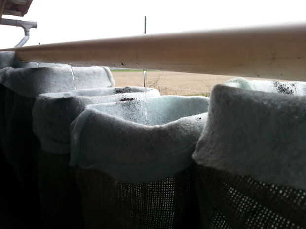 En el lado sur del cruce de los plantadores, el exceso de agua es recogido y transportado a la tubería de goteo más abajo y desde allí a través de los plantadores llegan a la pecera. En el lado oeste, después de pasar por 2 filas de macetas apiladas, el agua fluye a través de "ventana verde" de las plantas de sedum y luego pasa en el tubo colector principal y en la pecera. Después de pasar en el bio filtro, el agua comienza un nuevo ciclo.
