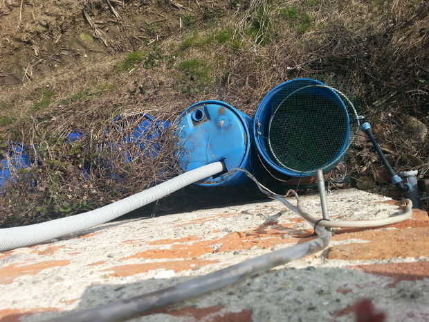 tres bombas de llevar agua desde el filtro que se conecta a la pecera, otro de los barriles de lluvia en el lado este del edificio. De esta manera, trato de compensar el agua perdida a la evapo-transpiración, absorción del suelo y las pérdidas pequeñas de la circulación, sin tener que rellenarlo manualmente.