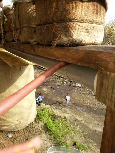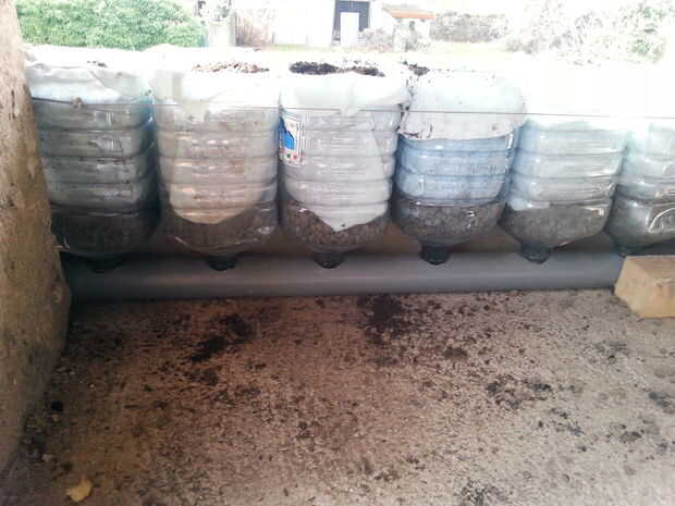 Taladré orificios de 4mm en las tuberías de goteo para permitir el paso a través agua y agujeros más grandes en la pipa que recoge para los cuellos de botella. Algunas conexiones entre tubos se realizan con mangueras de agua.