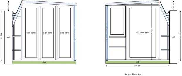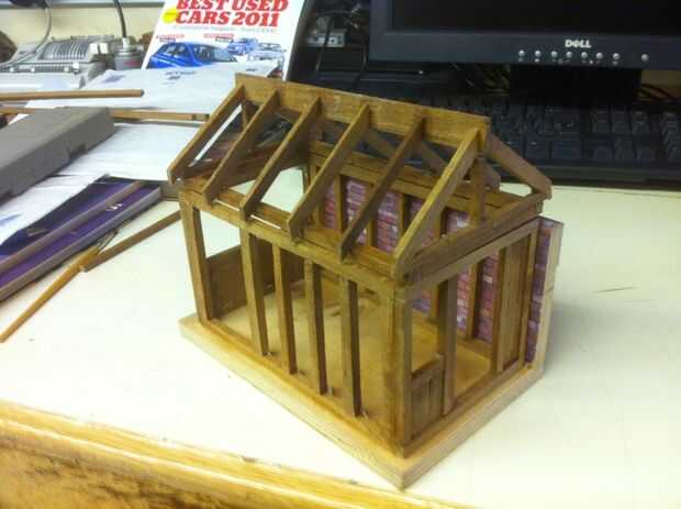 He utilizado Visio como una herramienta de diseño de la escala. I entrada de todos los tamaños de marco existentes del UPVC y jugó con posibles variaciones. Quería lindan el edificio sobre una pared existente de partido y no sobresalen demasiado lejos en el jardín. Como hubo una ruta existente (aunque no muy bueno!) Tomé esto como la extremidad de la anchura del edificio. Juzgué más o menos la longitud para que encajen en un cobertizo existente y otro 90degrees camino viejo a la primera. Lamentablemente no pude hacer la altura como me hubiera gustado como los marcos de las puertas son de tamaño adecuado para una vivienda principal bajo. Esto significó la base tendría que ser de profundidad mínima y la echada de la azotea también mantiene a la mínima. Yo esperaba para un estilo invernadero inclinado techo pero el resultado sería en el edificio final está demasiado alto. He hecho algunos modelos a escala de madera una vez que había decidido el formato final a mis vecinos para que pudieran tener algunos de entrada si querían.