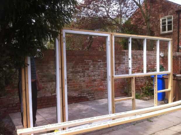 Dos días trabajo resultó en el armazón frontal terminado. Algunos errores que casi hizo. Las puertas habría sido abrir hacia el interior que no habría funcionado. Por suerte tuve fotos del edificio original que estas unidades UPVC habían sido extraídas y podrían referirse a éstos. El marco frontal acabado necesita manos extras para pasar de la rejilla una vez terminada.