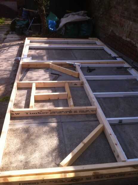 Decidí construir el bastidor delantero en un escenario de enrejado para que yo no estaba se arrodilló construcción. Usando varias abrazaderas podido sujetar todo en su registro mientras fijación cada parte. La ventana de tiempo fue el primero que se encuentra en la parte superior derecha del marco frontal. En cada fijación comprobé la Plaza antes de clavar o atornillar. Decidí usar montantes de doble entre cada uno de los marcos de PVC. Calculé la distancia moviendo todos los elementos al lado izquierdo de la viga inferior y medir el espacio restante. Yo entonces había dividido 100mm por los cuatro montantes y por tanto necesitan tener un espacio de 25mm. He encontrado una pieza de madera adecuada y utilizó esto para un espaciador al construir el marco.