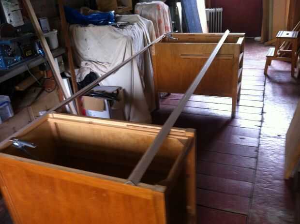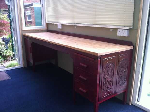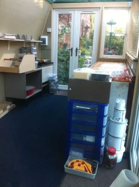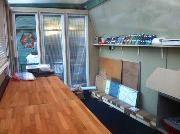 Matado a un escritorio de roble antiguo que había comprado hace años para un fiver, y con dos encimeras de Ikea improvisó un área de trabajo a medida para mis vitrales. Os adjunto las tapas con bisagras en el borde delantero para que puede ser inclinado hacia arriba para trabajar, si es necesario. Planeo hacer un mecanismo de elevación con un viejo coche scissor el gato finalmente. El lugar ha tenido unas pruebas de lluvia torrencial y hasta ahora parece hermético. Sin embargo, hace mucho calor cuando el sol está completamente en las ventanas delanteras, pero que no es del todo malo. Mi esposa ha comandado uno de los extremos como una ropa del tendedero, para que todo el mundo es feliz. Especial gracias a mi adorable esposa que pintó todo el edificio sobre varios muy calurosos días de verano! ella también me ayudó en varias etapas difíciles sobre la generación completa. Nena gracias! x