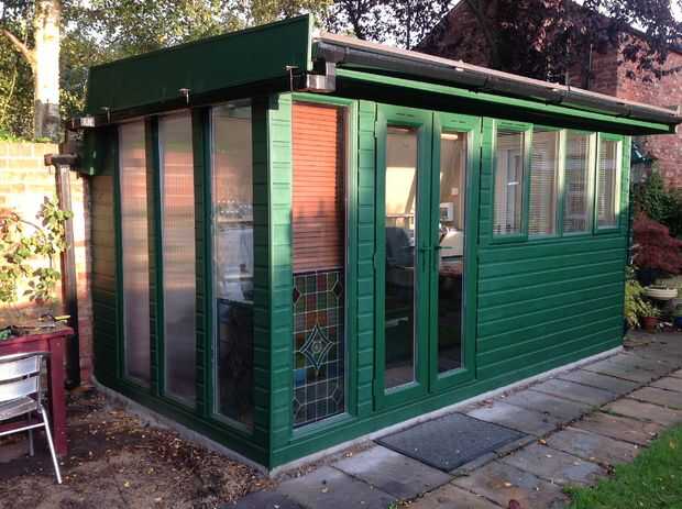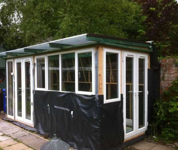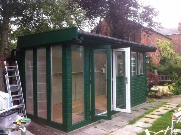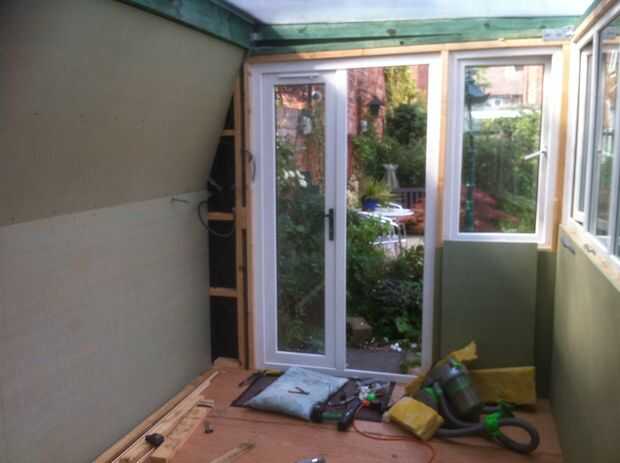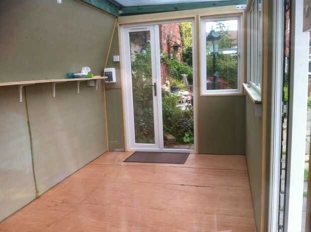 Elección de color y pintura tipo. Empareja el color exterior a mi cobertizo existente y la pintura es realmente albañilería pintura pero su muy fácil de aplicar y es durable. La pintura de upvc fue difícil y tuvo que ser afinado con esponjas abrasivas finas y una cartilla especial de Upvc aplica antes de pintar con la pintura verde de mampostería. el tiempo dirá si su durable o no. Para el revestimiento interior usé resistente al agua 12mm MDF con aislamiento de lana de roca entre los fotogramas. Hice el primer arreglo eléctrico antes del revestimiento. Traté de mantener la integridad de la membrana DPC en todo momento.
