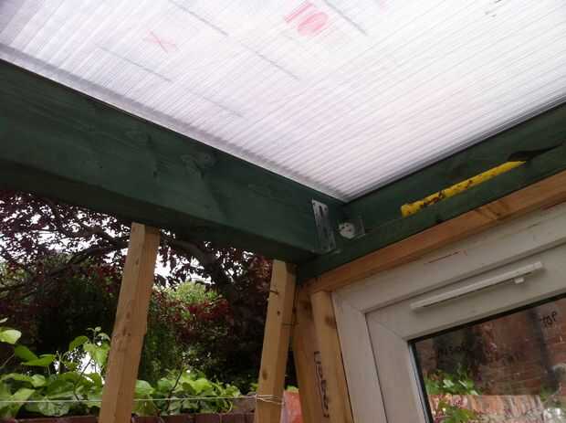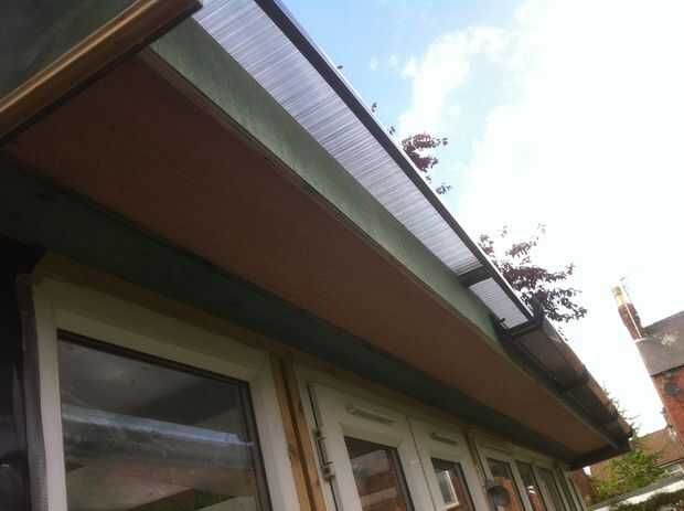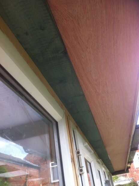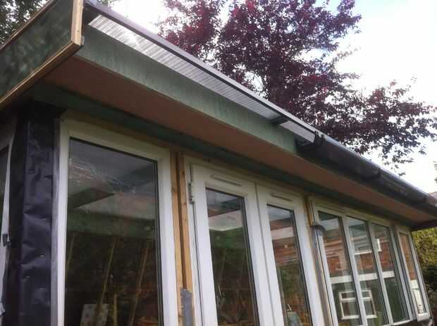 Hubo algunos problemas con las tuberías de agua de lluvia no significan para funcionar horizontalmente sino que clasifican hacia fuera con sellador de conducto cinta y silicona. Lo atraje en juntos por lo que finalmente puedo recoger el agua de lluvia en una tina para uso del jardín. El barranco de agua de lluvia frontal necesita un poco de toquetear para conseguir apretado pero terminó por aceptar. La facia delantera y sofito tableros donde los cortes fuera de la madera del suelo de 18mm. Había recortado todo con alguna sección de 'L' de madera que adquirí hace unos pocos años.