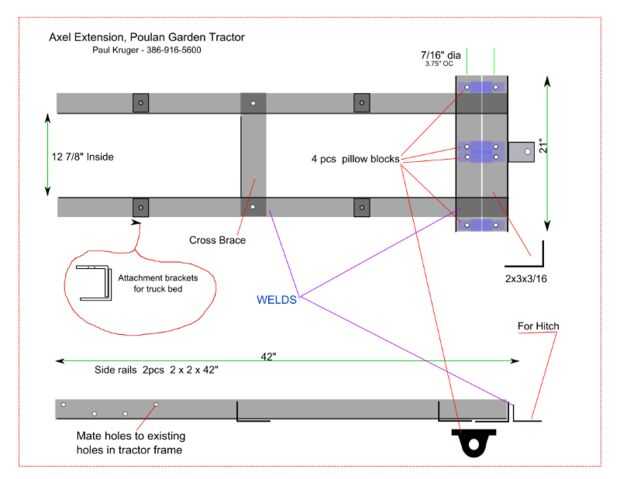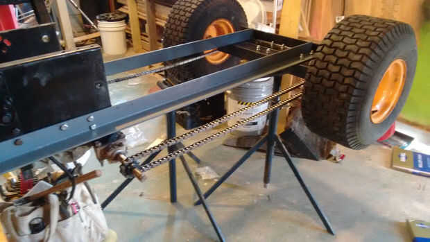 La primera imagen fue mi "diseño" en Inkscape para ver donde iba. Ampliar la distancia entre ejes fue recto hacia adelante y participantes dos tramos de ángulo de 2x2x0.25 de metal desguace local. Un travesaño al final tiene el eje nuevo montado en cuatro bloques de almohadilla. Cuatro son necesarios porque el eje nuevo es en realidad dos piezas. Esto es necesario debido a la transmisión del tractor con un diferencial. Dos cadenas de coche cada medio axel para conservar esta función, por lo que cada rueda gira como antes.