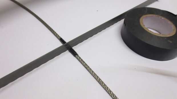 - Teniendo en cuenta de la distancia que se agregarán por las guarniciones de extremo de la cuerda de acero, corte la cuerda a 5-10mm más corta que la distancia medida.- Nota: al cortar la cuerda es más limpio y más fácil si primero envolver la cuerda firmemente con alguna cinta aislante donde vas a hacer el corte. ayuda a mantener la cuerda juntos.