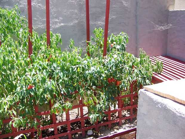 En la parte posteriora de la izquierda hay una planta de pimiento amarillo y justo detrás el pimiento amarillo es una planta de pimienta plátano dulce. A la derecha de ésos es una planta de berenjena, detrás de la berenjena es una planta de fresa y en la esquina es una planta de calabacín. Todos los son justo en esa un esquina!