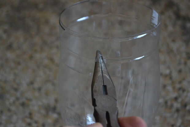 Hacer un agujero en la botella (aproximadamente 2cm por debajo del corte). El agujero debe ser lo suficientemente grande como para caber el tornillo-vea la siguiente imagen.