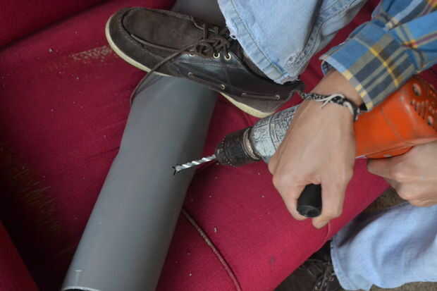 Hacer dos agujeros en la parte posterior del tubo. Uno en la parte superior y el otro en consonancia con el corte más baja (ver en la siguiente imagen cómo debe buscar).