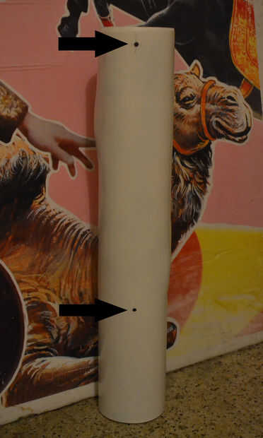 El agujero superior sirve para colgar el tubo en la pared. El alineado con la abertura del pasado sirve para colgar la botella de plástico (que funcionará como un tierra fuerte-ver siguiente paso).