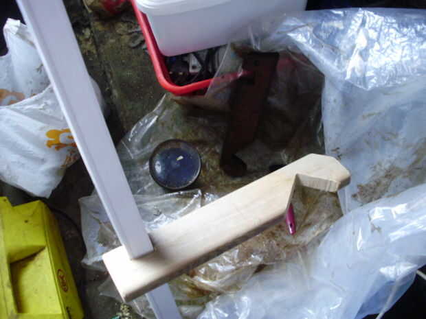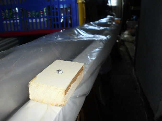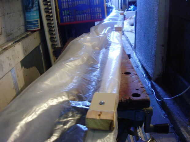 Entonces fijé la lámina de plástico (2,7 m x 1.8 m) mediante la reducción de algunos pequeños pedazos de madera, laminado plástico redondo el enlace una vez a enroscarlos en cuatro lugares a lo largo de la canalización (gracias a mi papá por este Consejo). Hice exactamente lo mismo en el otro extremo peso hacia abajo e impedir que el plástico está movido por el viento.