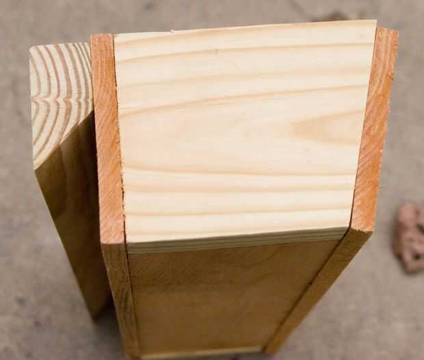 - Cortar dos cuadrados de 5.5" de 2 x 6. A lo largo de un borde, corte un ángulo de 15 grados. (Sierra para cortar ingletes hubiera estado bueno para esto).