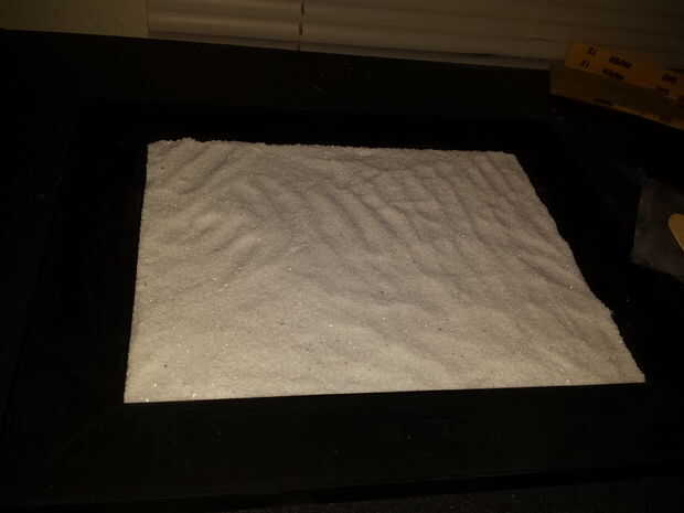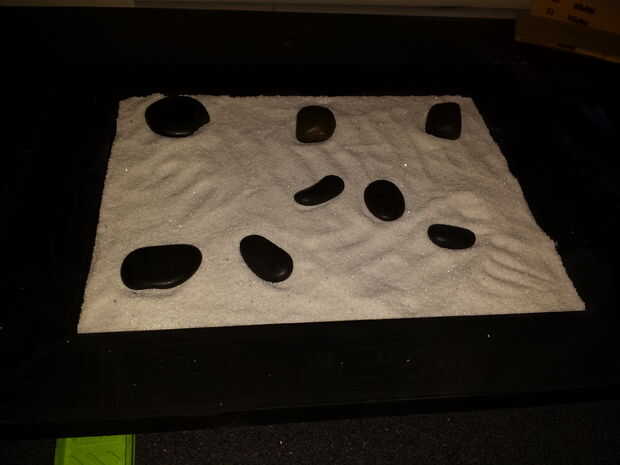 Aquí está una pequeña cartulina jardín Zen nuestros equipos en Londres lo hizo con algunos cuadros de ahí, un poco arena y un par de piedras. Somos una empresa de mudanzas y utiliza una de las cajas de un movimiento reciente. En cuanto a la arena y p