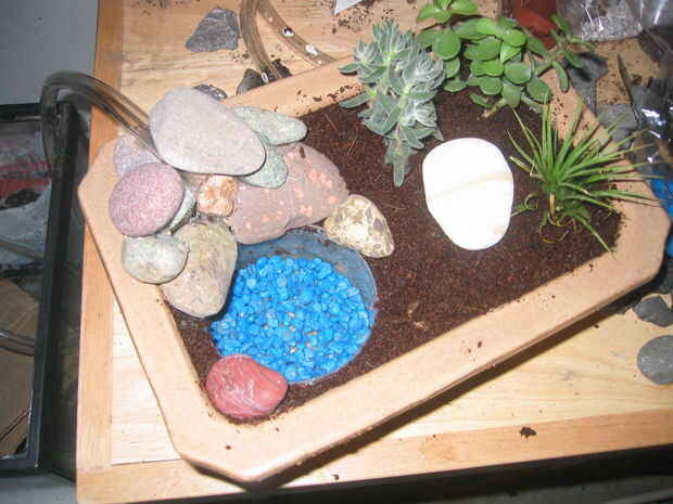 Se pueden encontrar unas rocas "bonitas" cerca del océano, pero si no vives cerca de la costa se pueden comprar decorativo piedras en su vivero local tienda o ferretería o incluso ikea. Usar una pistola de pegamento, pila y pegar varias piedras para crear elevación por su efecto de cascada. En esta pila de piedras, pegue un tubo que actuará como su tubo y pegar más piedras en la parte superior. Apunte el tubo hacia el plato contenedor que previamente instalamos, esto actuará como una piscina.
