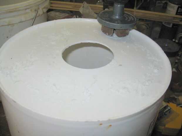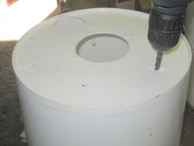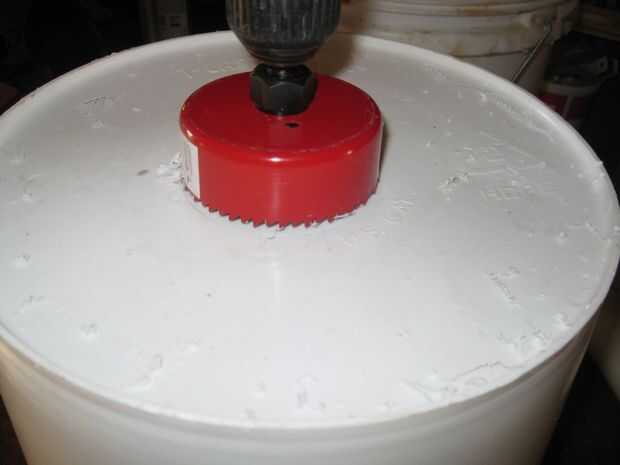 Otra vez con un montaje taladro serrucho o una sierra de vaivén, corte un agujero lo suficientemente grande como para el tubo de PVC. Este orificio está situado cerca del lado del cubo.
