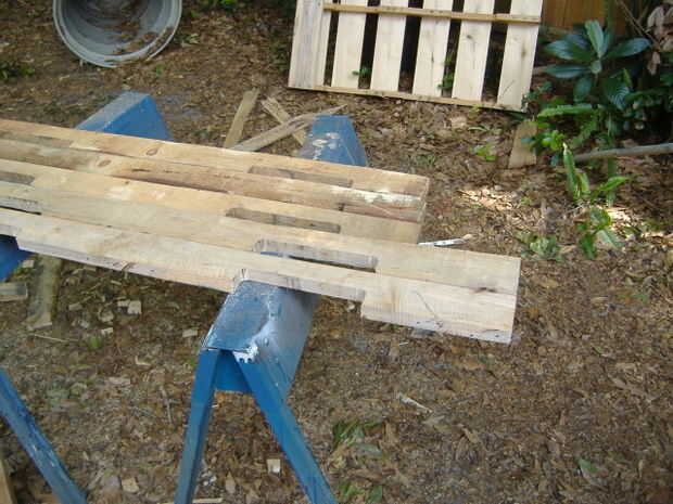 Hace aproximadamente un año, me dieron varias paletas industriales de la fuerza de 2x6s. Después de renunciar a tratar de separar las secciones largas, usé una sierra circular para cortar lo que considero el material utilizable. Me quedé con cuarenta