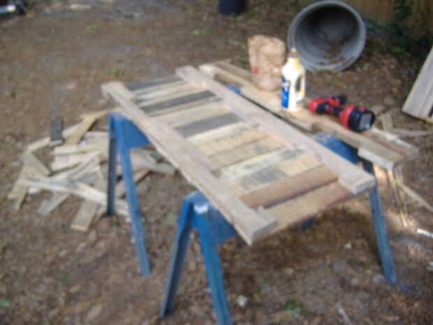Hace aproximadamente un año, me dieron varias paletas industriales de la fuerza de 2x6s. Después de renunciar a tratar de separar las secciones largas, usé una sierra circular para cortar lo que considero el material utilizable. Me quedé con cuarenta