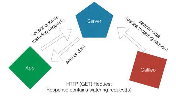 Cerca de las plantas, pones el Galileo, que actualiza los datos del sensor en el servidor y obtiene las solicitudes de riego manual.