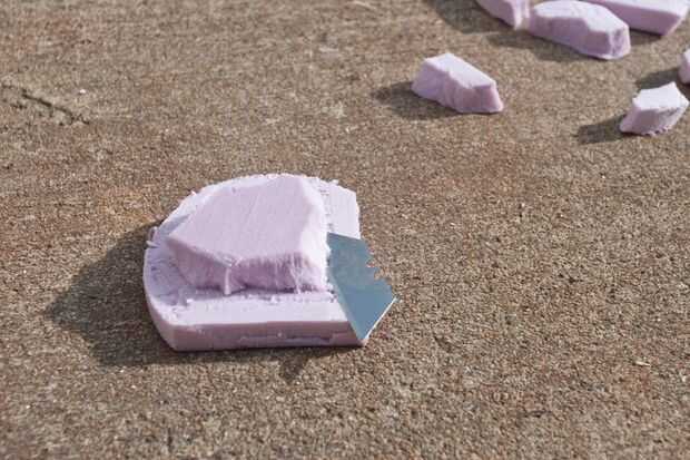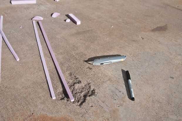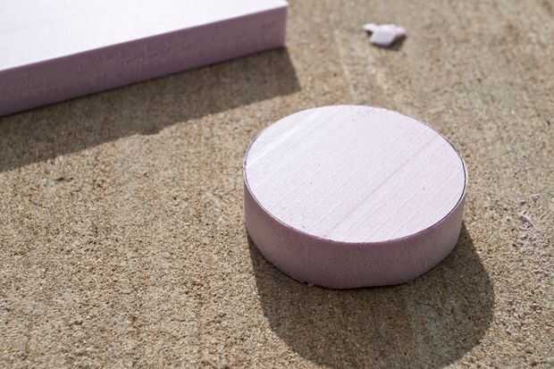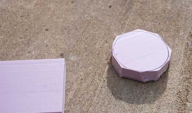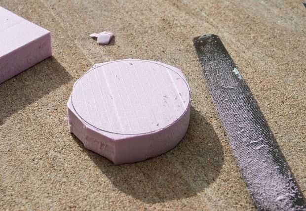 Mi diseño consistió en un círculo de 3" y una tira larga y fina que sobresale del círculo. Marcado, corte y presentó el círculo que forma, y cortan algunas partes por lo que encajaría en la esquina de la forma. Luego corté todo a la mitad, reduciendo su grosor de 1" a 1/2". Dejando en el completo de 1" espesor habría causado dificultades al verter el hormigón. Utilicé el mismo método básico de puntuación/plegable/rotura de la espuma para crear las tiras largas. Porque la espuma es bastante delicada, que tenía que ser un poco más cuidadosos, pero funcionó bastante bien.