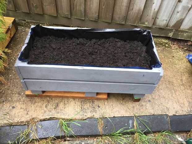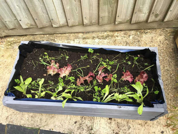 Aquí está, llena de compost y plantado con las plantas de lechuga, zanahoria y puerro.