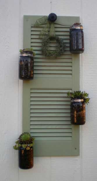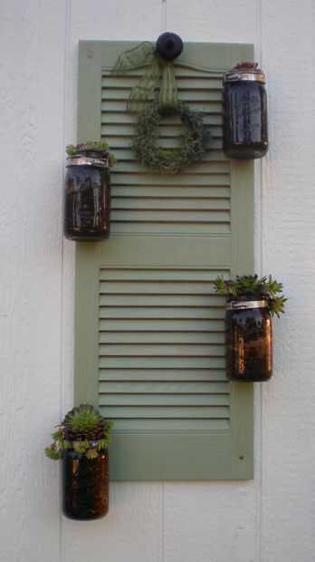 hice esto usando una ventana del obturador que sage primered y pintado verde. Entonces había montado 4 abrazaderas de metal y coloca a mason conservas tarros en las mordazas y apretó hacia abajo. Llené los recipientes con una mezcla de suelo de rellenado y harina de pescado pelotillas y agrega un finniale a la parte superior central y colgó una guirnalda de pequeña ramita cubierto de musgo hierba y colgado con una cinta... Colgado el obturador de Jardinera en el frente de mi casa verde y me encanta a la personalidad que trae el invernadero... fácil fácil construir
