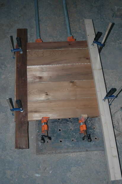 Un montón de pegamento fue utilizado entre las placas, y la primera tabla que ha establecido también fue atornillada en las juntas transversales. Una vez que todas las juntas estaban en posición, las abrazaderas fueron utilizadas para seguir todo recto y apretado.