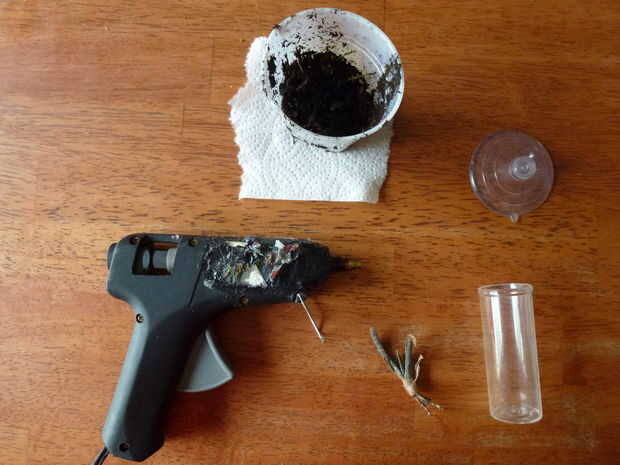 Antes de comenzar, usted necesita recoger unos pocos materiales. Encontrar un tubo de ensayo o tubo pequeño de vidrio. Debe ser por lo menos 2" de largo y aproximadamente 1" de ancho. Encontrar una pequeña cantidad de rellenado de tierra, una copa de succión, una pistola de pegamento caliente, una cuchara (no se muestra) y un corte. Usé un corte fuera de una planta de aloe.