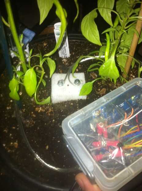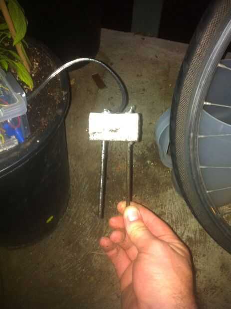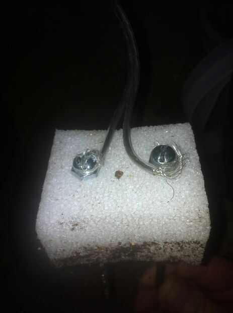 Para la humedad del suelo sensor utiliza una longitud de cable (lámpara o speaker wire hará) y despojados de los extremos y al uno final de los dos pernos con las tuercas para fijar el cable. Empujé los pernos a través de un trozo de espuma de poliestireno para dar la configuración de un poco de estabilidad. He usado conecta rápido para sujetar el otro extremo a la fuente de alimentación y Arduino.