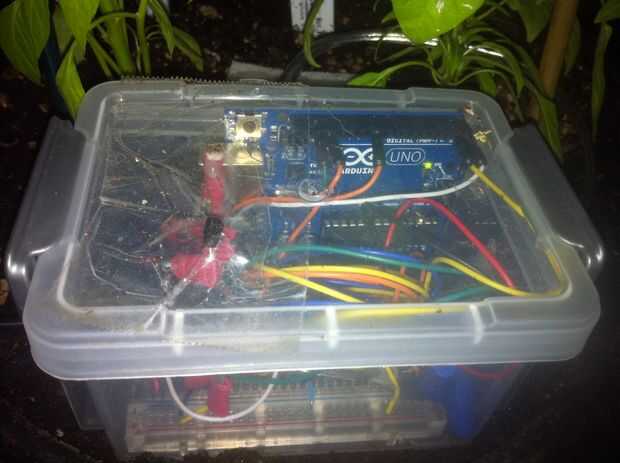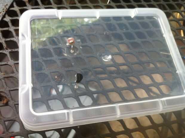 Moví todos los componentes electrónicos a la caja. Usé cinta de doble cara para montar el tablero y el arduino al recinto. Penetra los agujeros a través del caso para montar los sensores de luz y temperatura exterior y sujeté con aprisa conecta. Usé cinta para hacerlos algo impermeable.