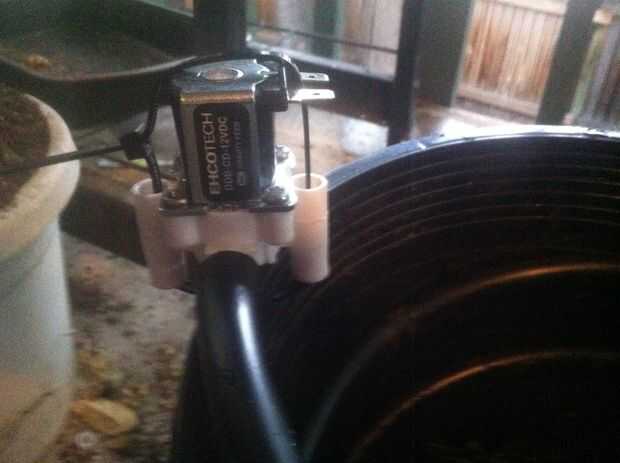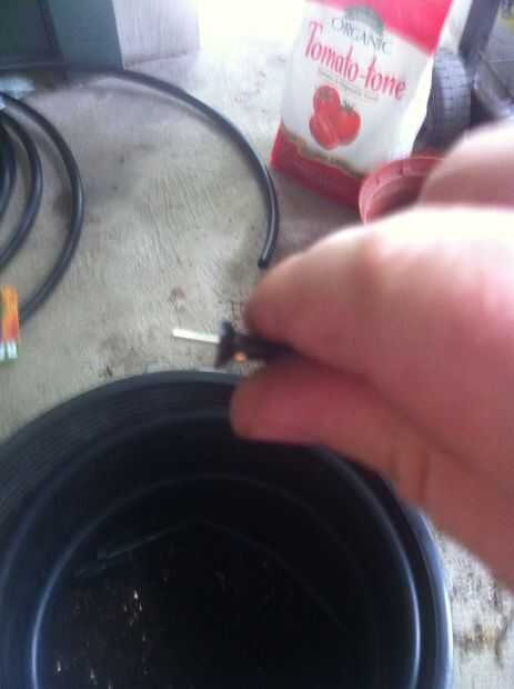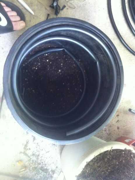Tengo una instalación de botellas de plástico recicladas como el suministro de agua. A partir de ahí corrí 1/2" tuberia de riego al solenoide. Luego corrí el tubo en el interior de la jardinera con unos 3" entre las bobinas. Después de la tubería usé una tachuela para empujar los agujeros en la tubería. Espaciar los agujeros unos 6" aparte. Simplemente estaba usando ensayo y error para obtener la cantidad del flujo de agua que estaba queriendo. Había doblado el tubo y zip atado al final para detener el flujo en el extremo del tubo.