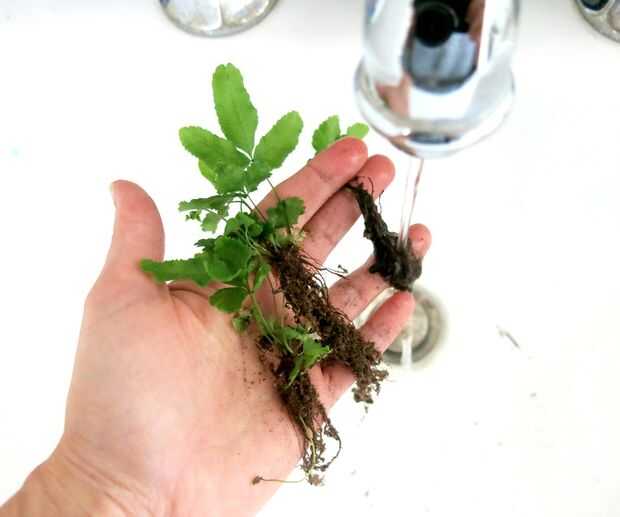 1. Enjuague cualquier suciedad que permanezca fuera de los sistemas de la raíz con agua a temperatura ambiente.