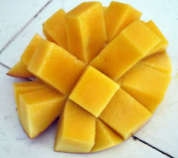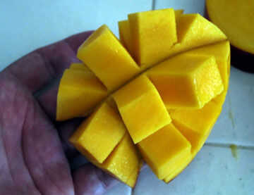 Puede cuchara la fruta fuera de la piel con una cuchara, pero como cortar un patrón entrecruzado en el lado de la carne, cortar la piel pero no a través de él y luego POP al lado y disfrutar.