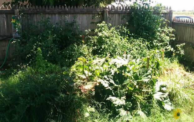 Antes de que ' tho, hubo una cosecha abundante a finales de mayo. Manera que podrían comer más tomates que nosotros y terminaron tomando un recipiente de 5 cuartos, lleno completo, a la familia. También hay calabazas, pimientos y sandía en la primera fila. Los tubérculos estaban en la fila del medio y ser superado por los tomates. Valla en el fondo es 6 pies de altura. Todas las plantas de tomate habría sido que altura o más, pero las jaulas de tomate se derrumbaron. Este año, estoy poniendo en una cerca de 3 alambre frente a conseguir las plantas para crecer y facilitar la cosecha. Y no todas las plantas de tomate.