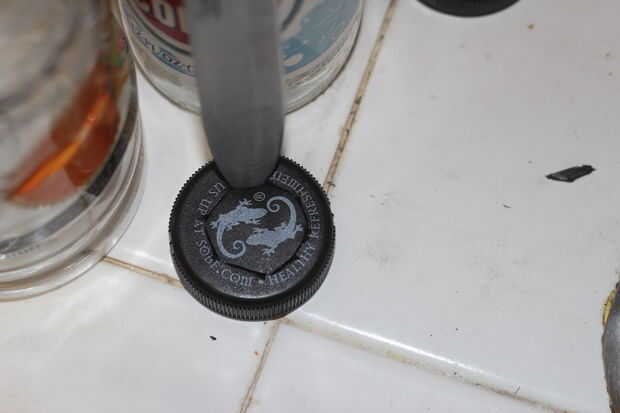 3. empiece a cortar el interior de la tapa de la botella para la botella de vidrio firmemente en el centro. (Con la tapa de la botellaBoca abajo.)