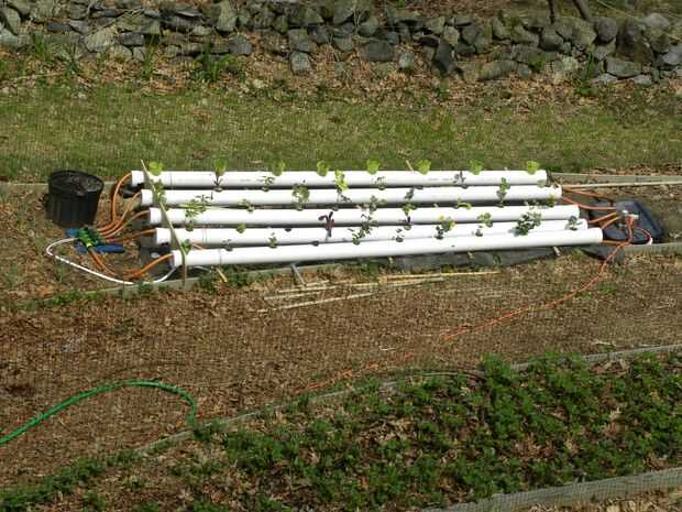 Este jardín hidropónico simple está construido sobre una pequeña pendiente para drenaje del colector de drenaje (aproximadamente 1 en 10 pendiente) y un agujero en el suelo de la bañera de nutrientes.