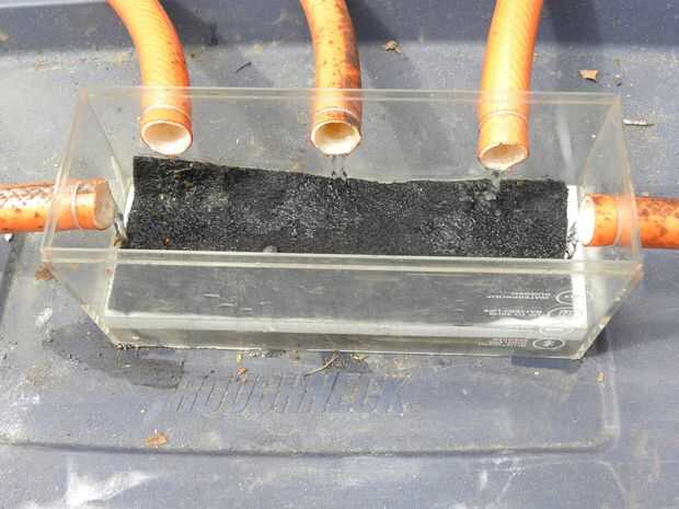 El cuadro de vista tiene un falso suelo con agujeros para mantener el filtro de carbón de la salida (más manguera) en la parte inferior de la caja con una tapa ajustada para mantener el sistema limpio.